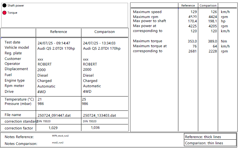 Modyfikacja objęła model Audi Q5 z 2009 roku z silnikiem 2.0 Diesel o fabrycznej mocy 170 KM i 350 Nm, wyposażony w napęd Quattro. Jednostka sterowana jest przez sterownik Bosch EDC17C46, a za przeniesienie napędu odpowiada skrzynia DL501 gen1. Pomiary na hamowni Bapro 4×4 wykazały serię na poziomie 170,4 KM oraz 353 Nm. Prace wykonano przy użyciu programatora i loggera Autotuner. Przywróciliśmy oprogramowanie silnika sprzed akcji Dieselgate oraz wykonaliśmy update i optymalizację punktów zmiany biegów w TCU. Wynik końcowy to 198,1 KM oraz 389 Nm. Przyrost ograniczono ze względu na niestabilne turbo oraz parametry AFR, dbając o aspekty ekologiczne i trwałość podzespołów.